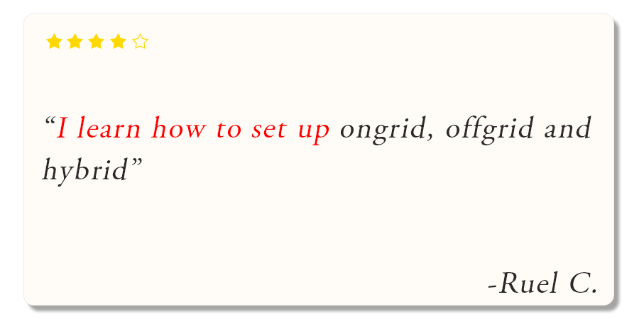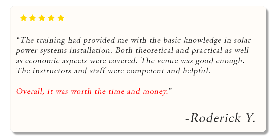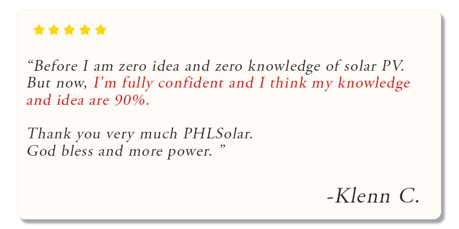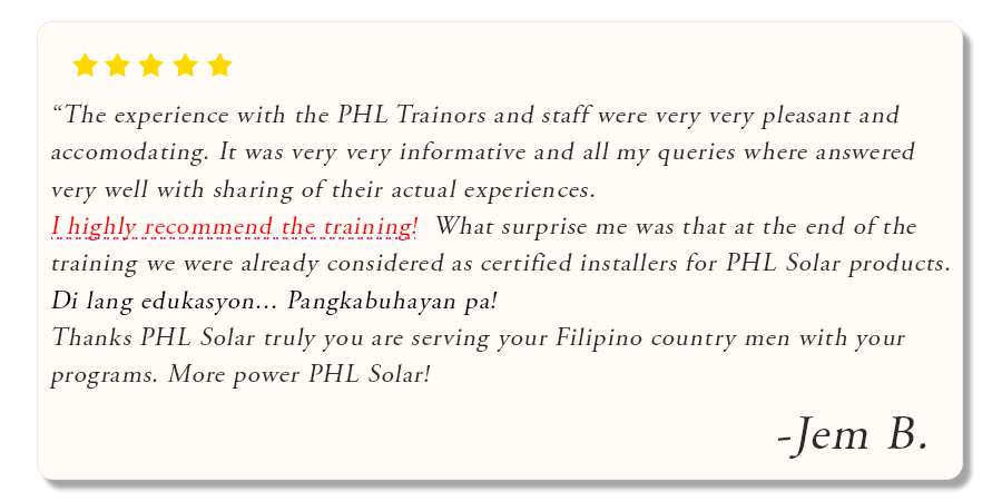 PHSolar Industrie services are based on in-depth understanding of the latest renewable energy technology to lead the shift into renewable for all sectors and to be innovate partner of every Filipino household and business. Ensures attending to this training will provide you a broad understanding about Solar PV works. From Solar PV System theory up to hands on training with the guidance of our best engineers and installer.
